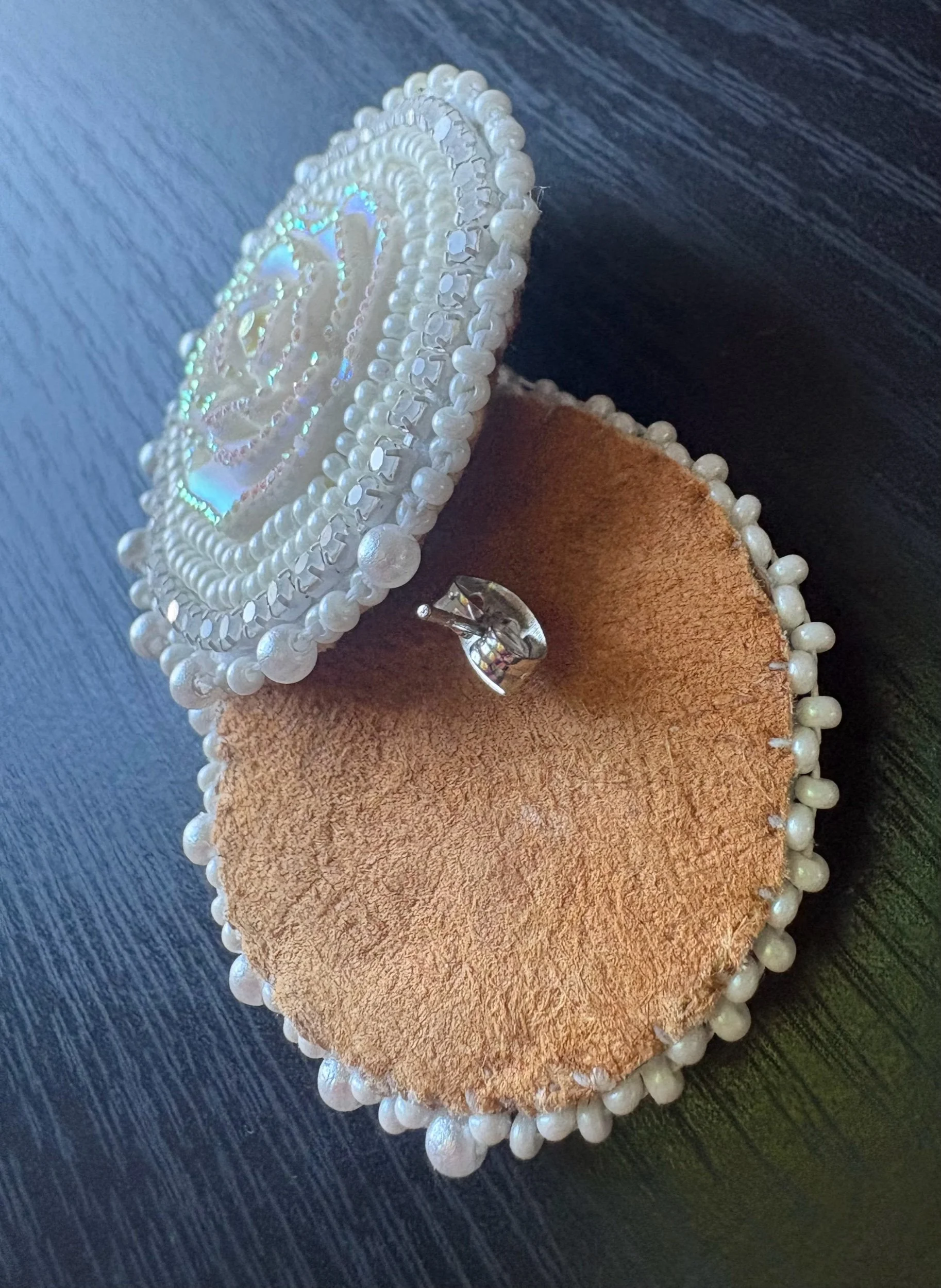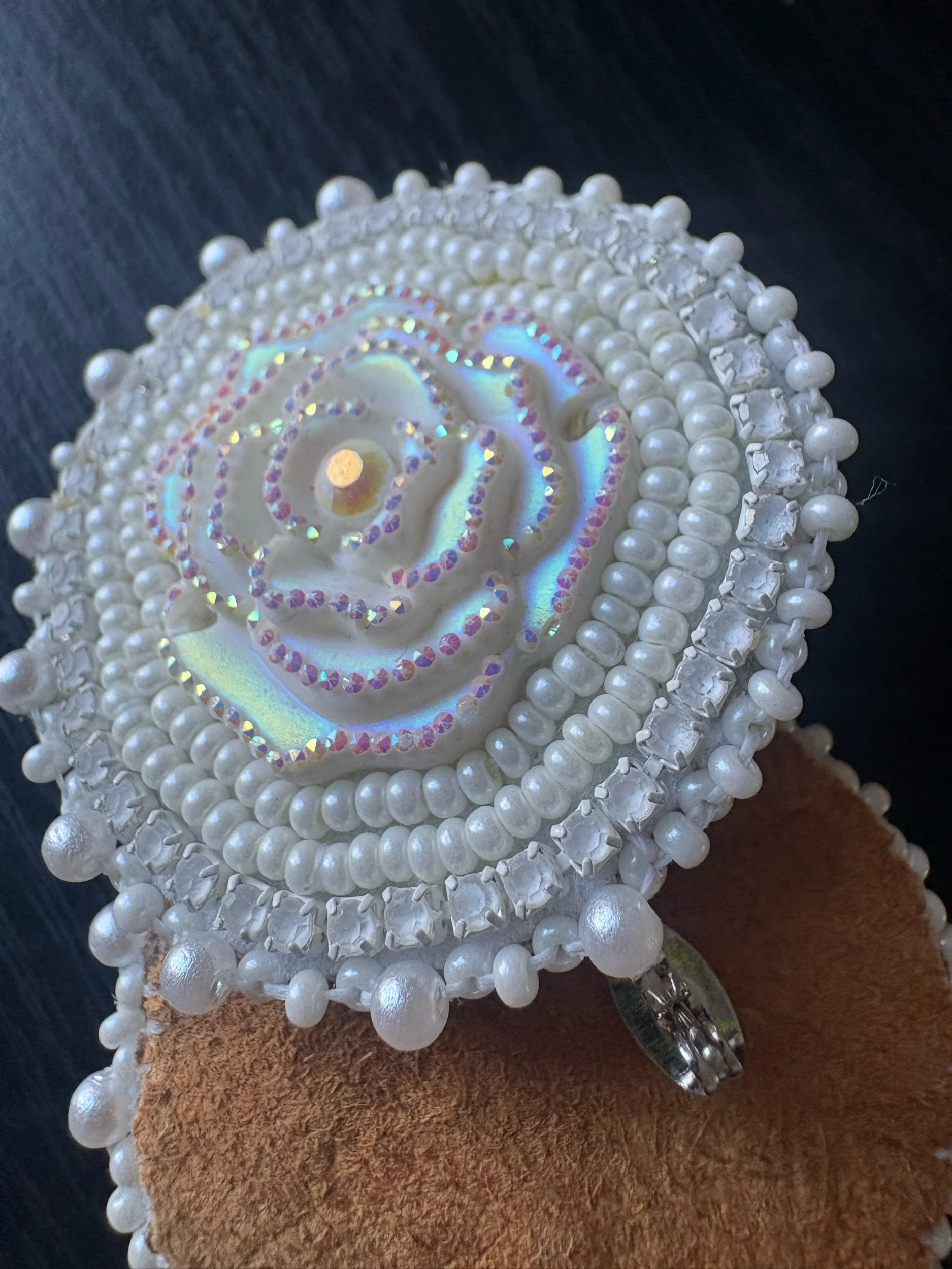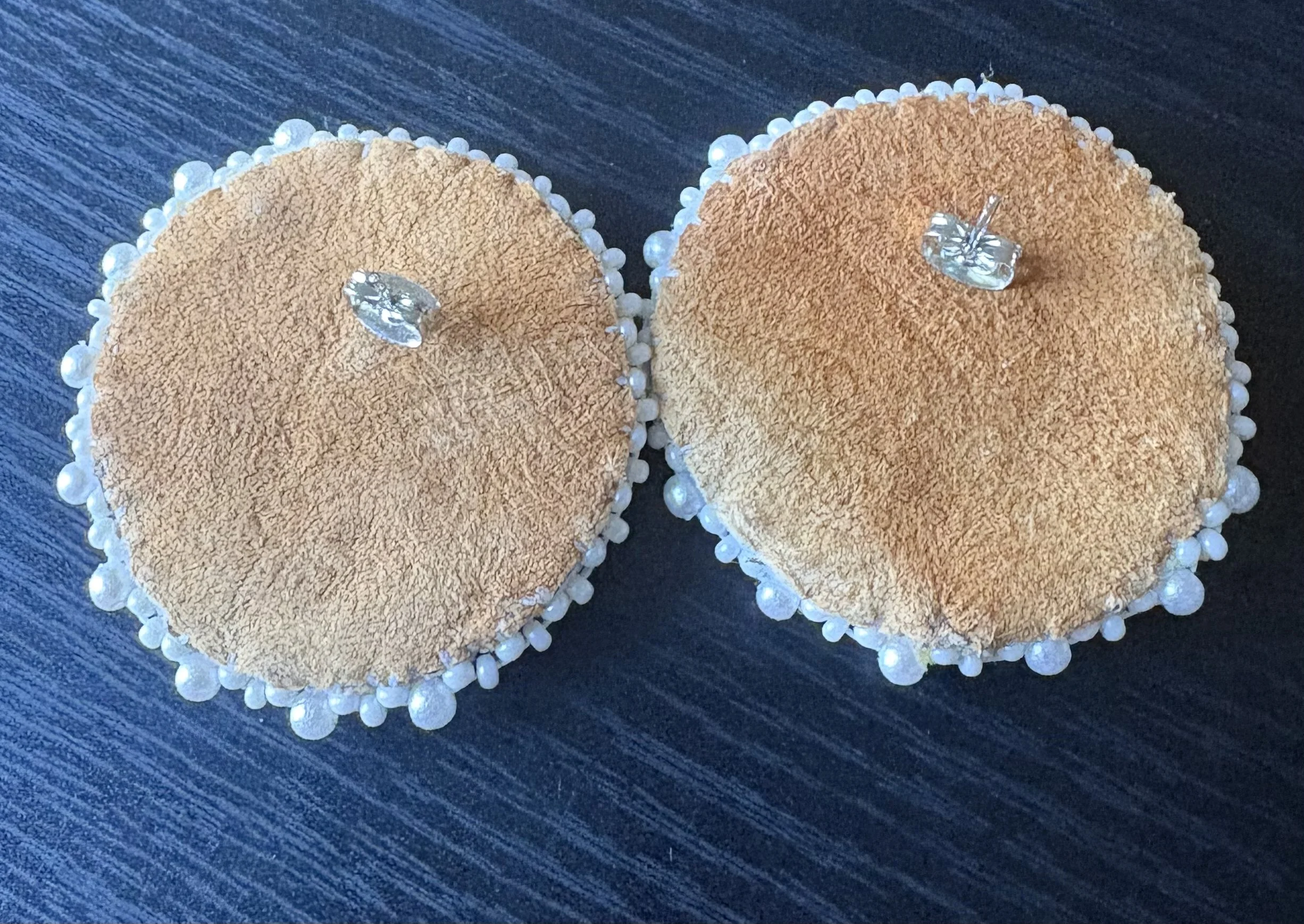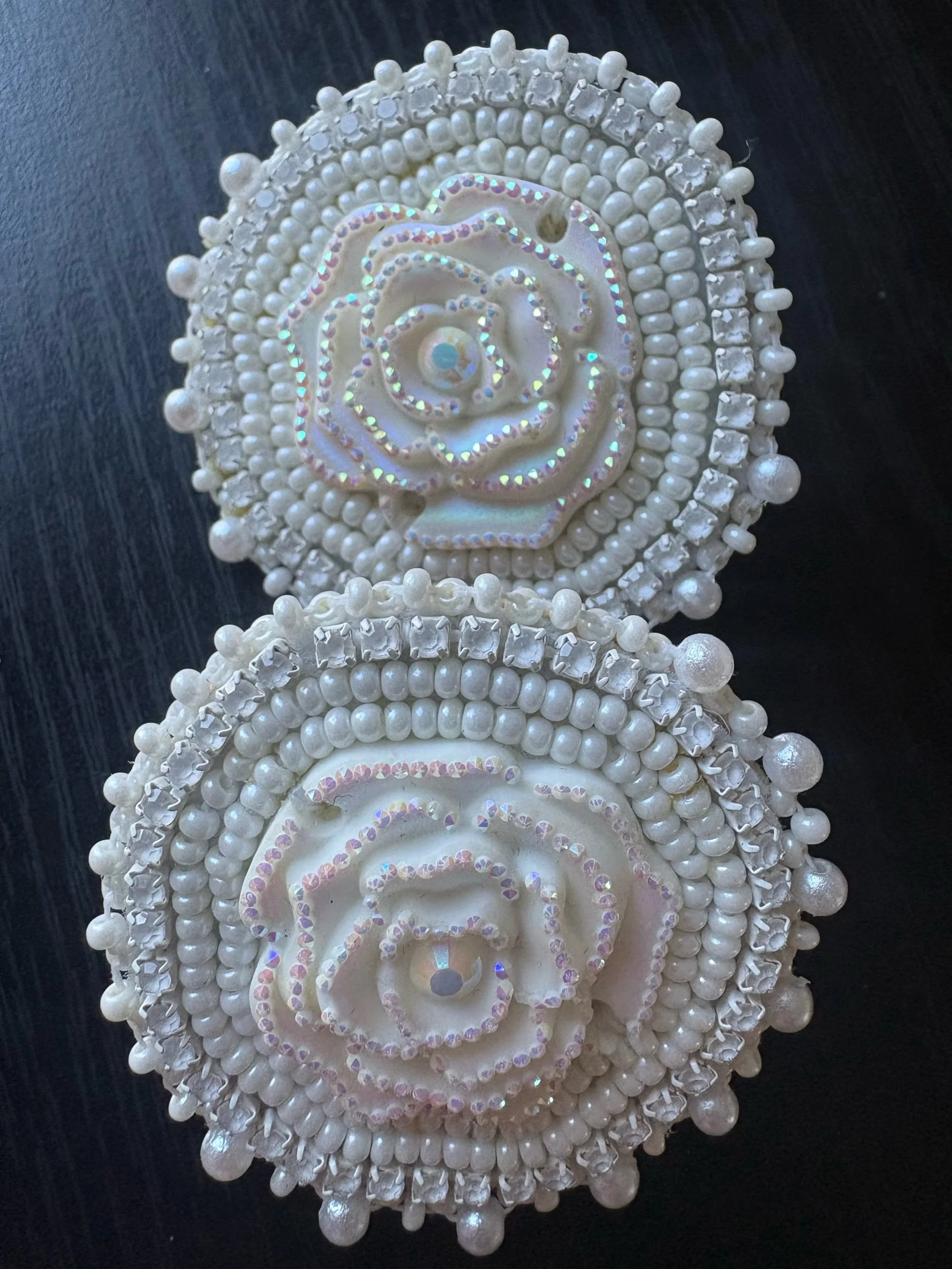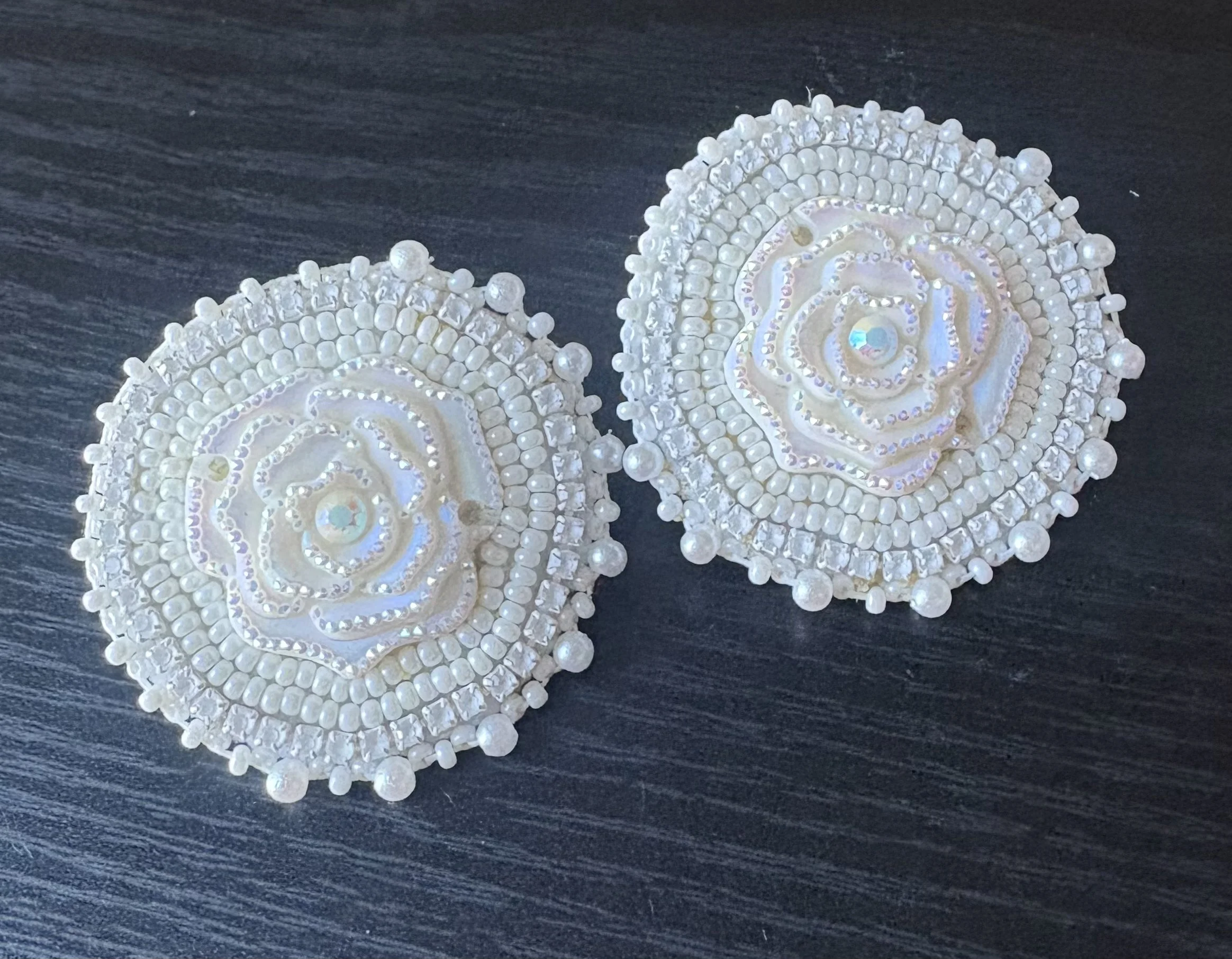 Beautiful handmade beaded white rose earrings. They have tanned deer hide backing and small sterling silver earring posts.