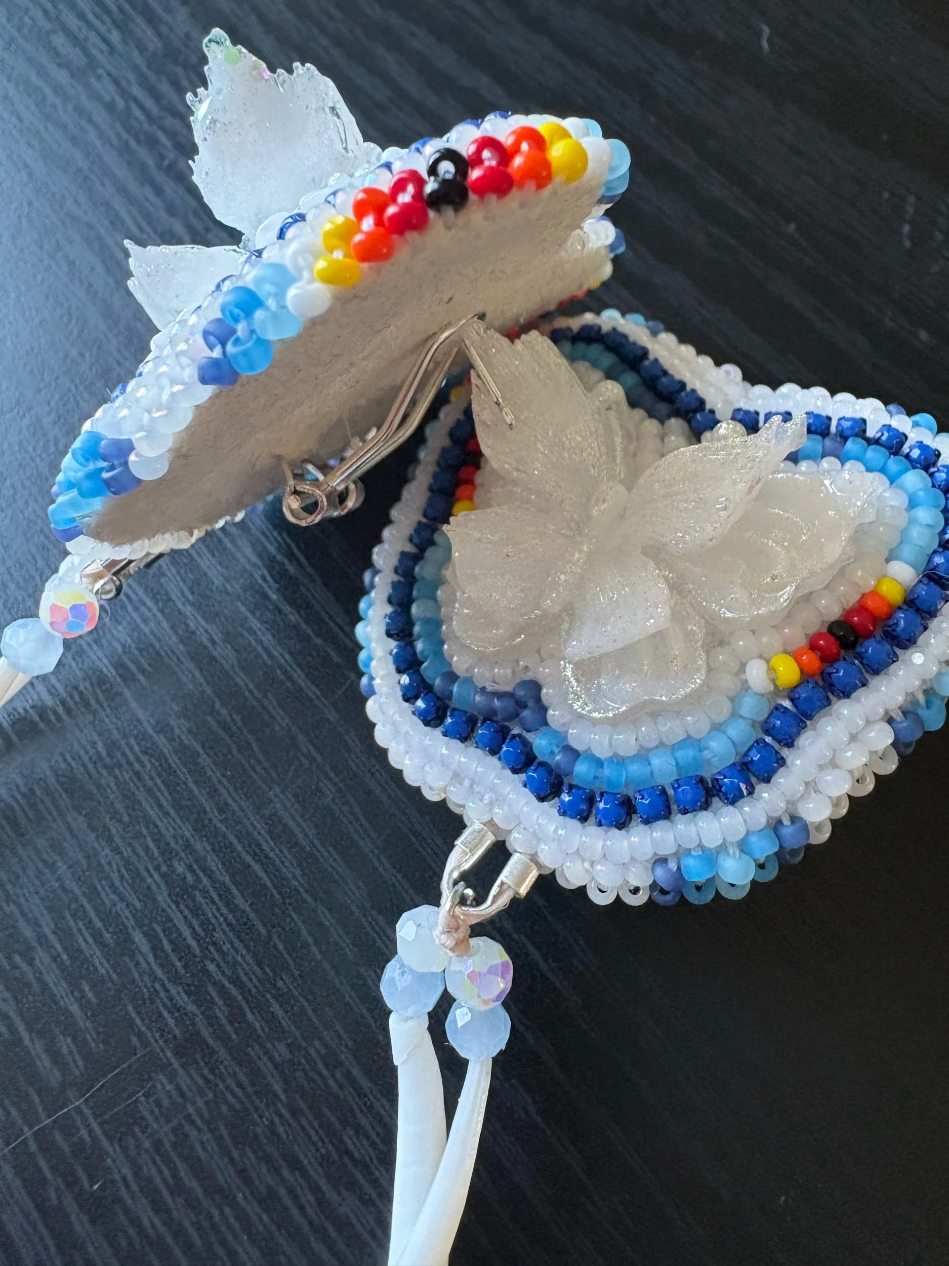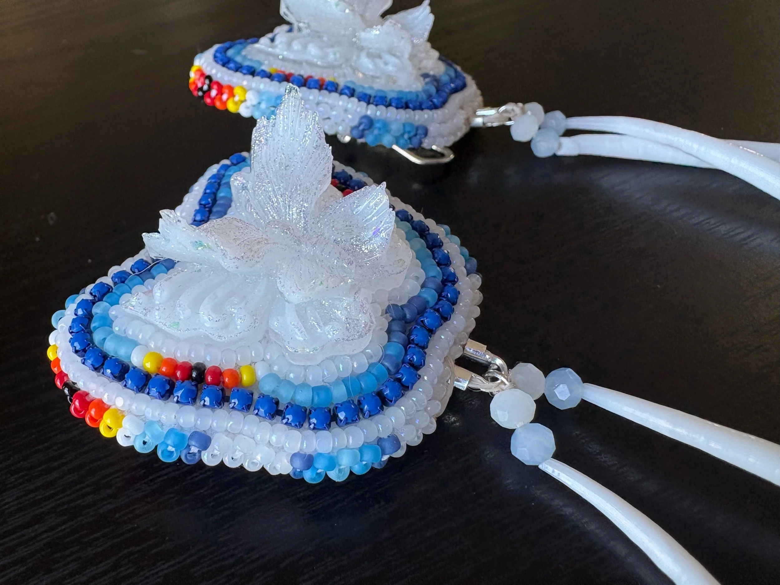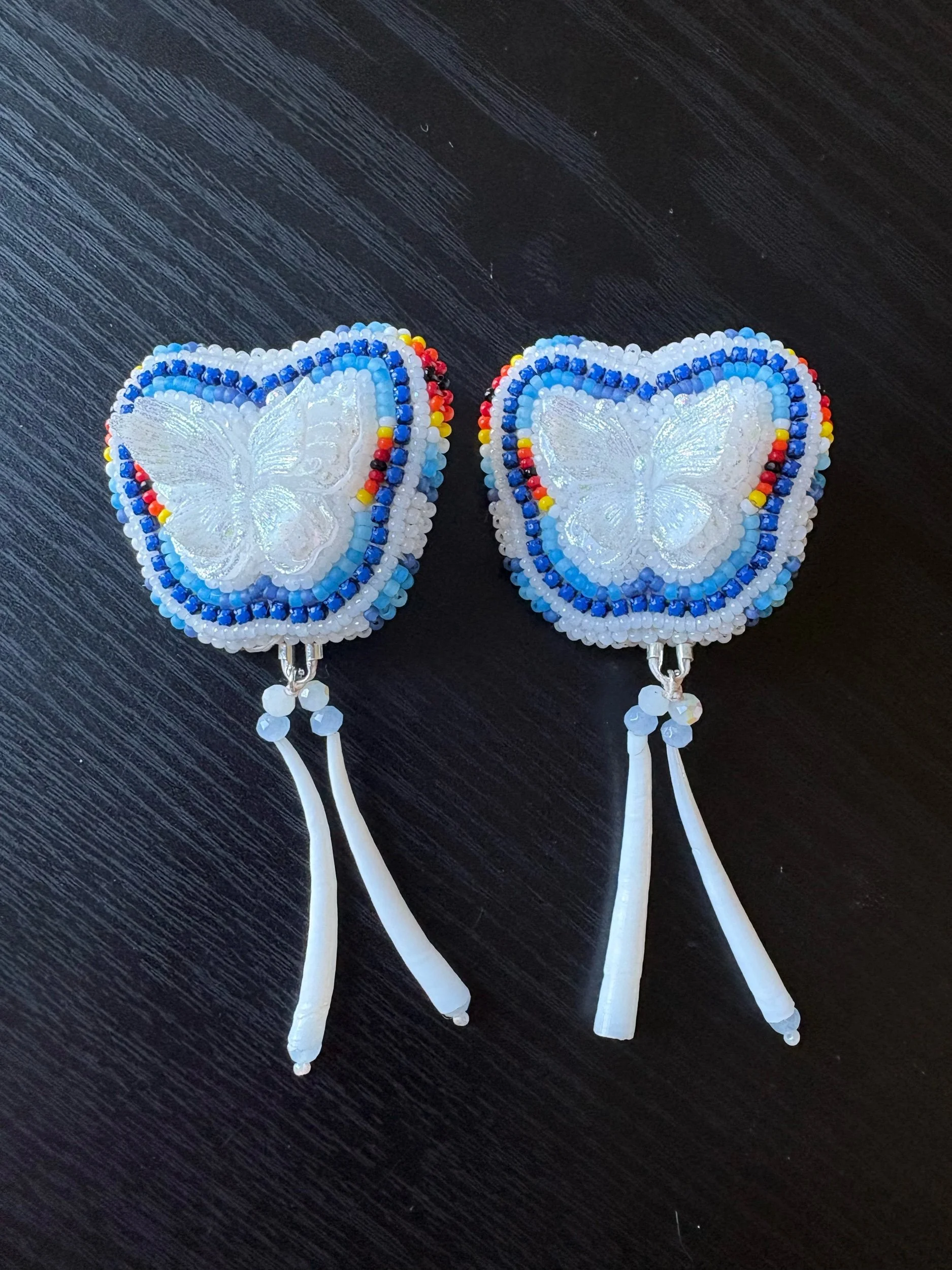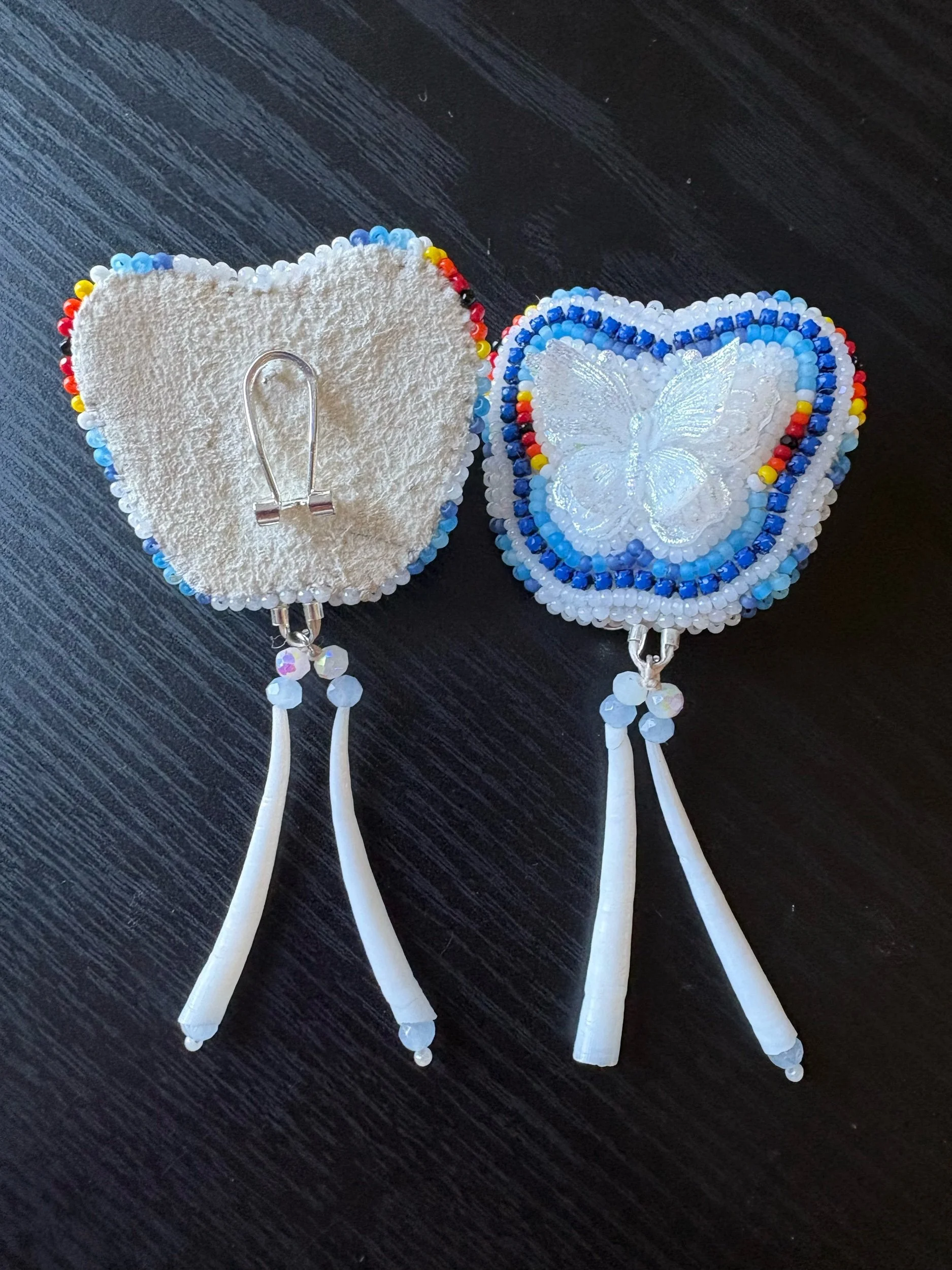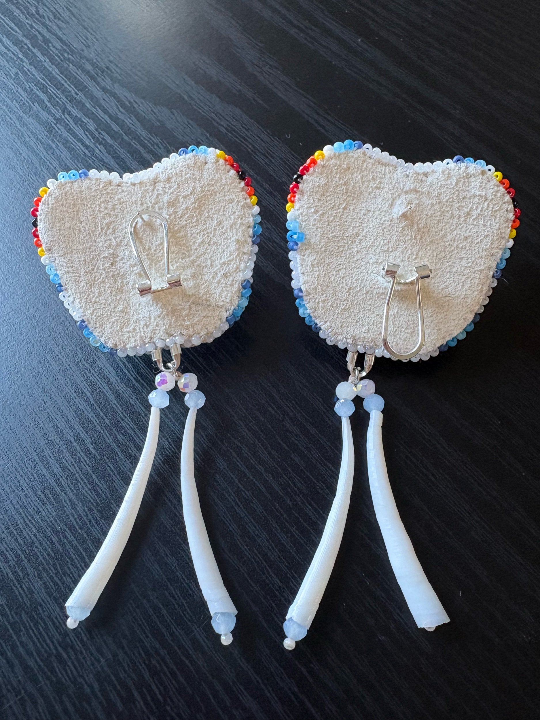 These super cute and stylish earrings are sure enough to make your outfit stand out. They are very lightweight, and handmade with genuine Dentalium shells. They have a buckskin backing and fingernail posts.